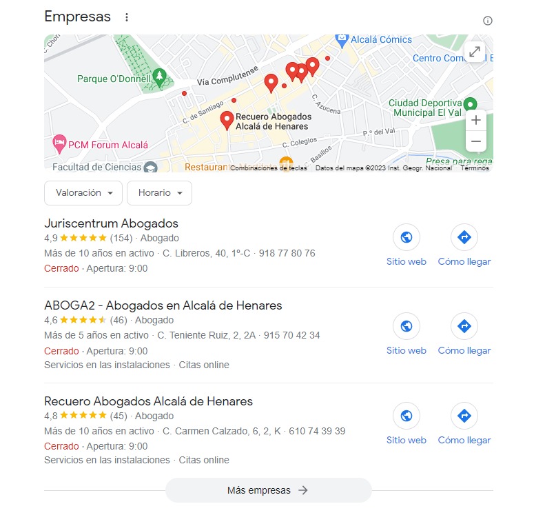 Este mapa que nos ofrece Google, llamado oficialmente LOCAL PACK por el propio buscador, nos devuelve normalmente tres resultados, los que Google considera más óptimos para el usuario en esa búsqueda dependiendo del término de búsqueda y de donde estés físicamente realizando la búsqueda. Recordemos que lo saben todo, saben desde dónde, cuándo, etc…