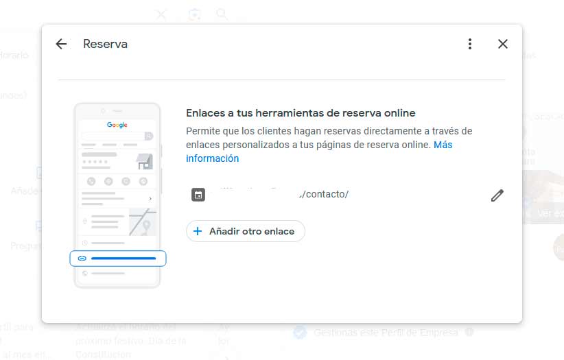 La función quizás más importante de la ficha de un restaurante es el BOTÓN DE RESERVAS. En la ficha de Google Negocios puedes rellenar un enlace donde pones el link al sitio de tu web donde hagas las reservas.