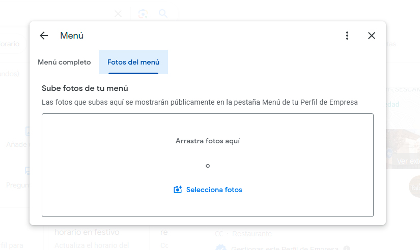 Además permite hacer algo muy interesante para el usuario que visita la ficha de tu restaurante y es que se puedes poner FOTOGRAFÍAS DE LOS PLATOS lo que hace aún más atractivo al perfil ya que el usuario puede ver los platos incluso antes de ir al restaurante, lo que podrá incrementar la conversión y consecución de nuevos clientes en el restaurante.
