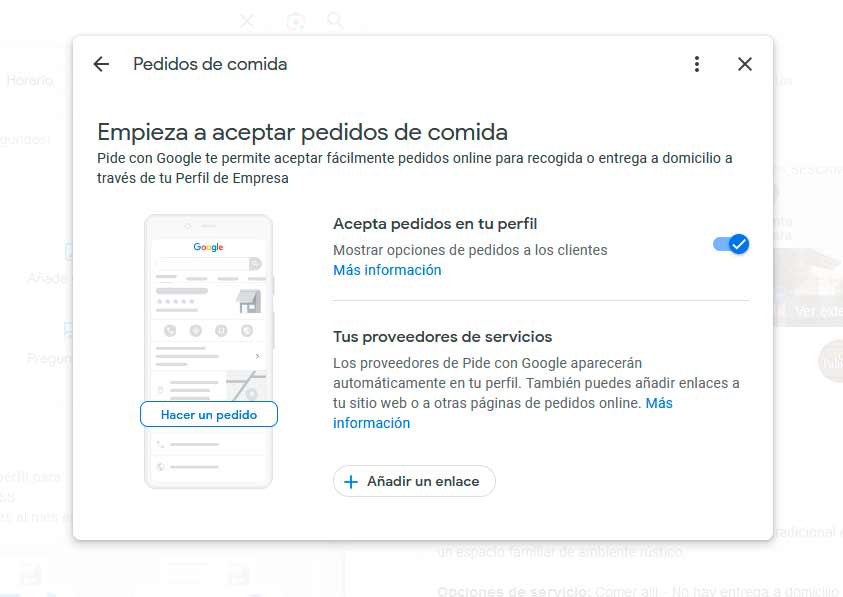 Puede que ofrezcas al cliente pedidos de comida a domicilio. Para ello hay una sección de pedidos online donde se puede enlazar a plataformas donde recibas pedidos como Glovo, JustEAT y similares… Te permite clicar y desclicar hacer pedidos en tu perfil y también permite enlazar proveedores de servicios en este sentido poniendo enlaces a esas plataformas donde realices los temas de pedidos.